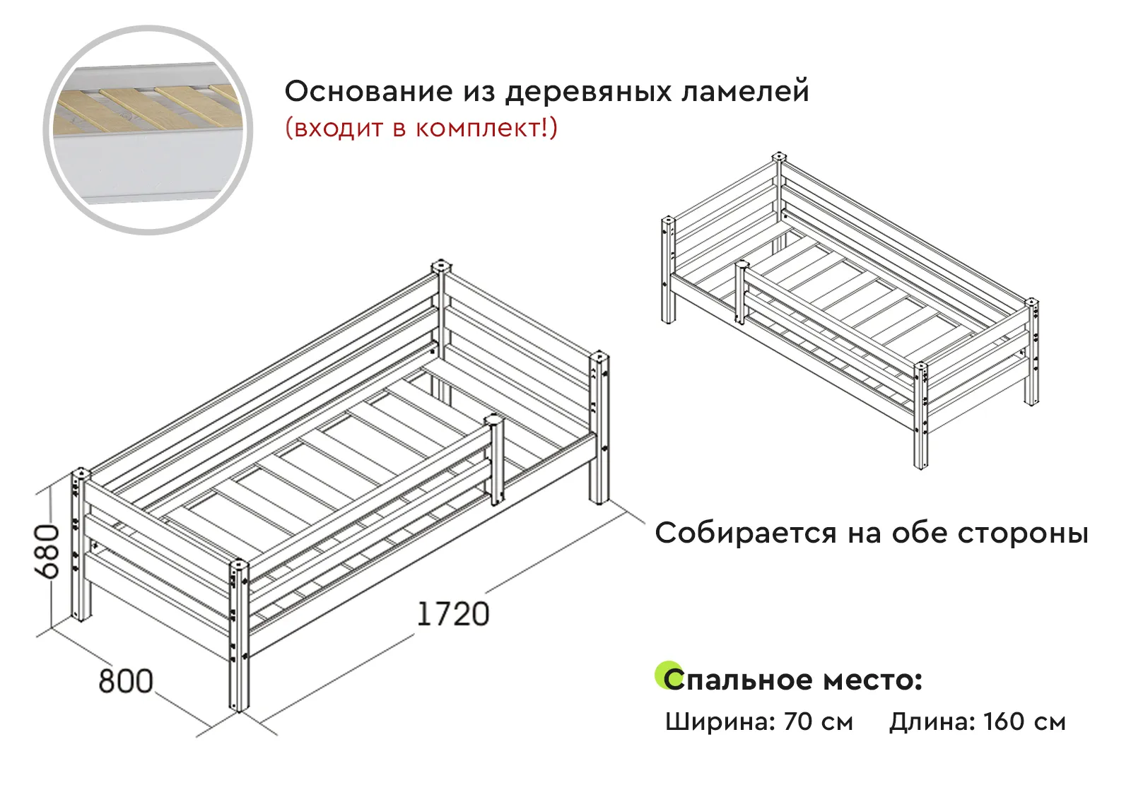 Матрасное основание (комплект ламелей) входят в комплектацию кровати. Собирается на обе стороны