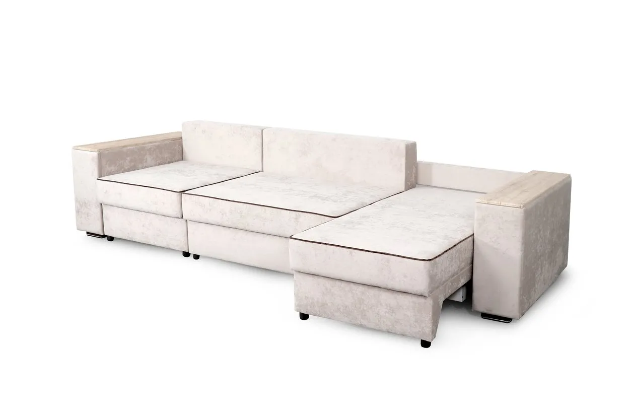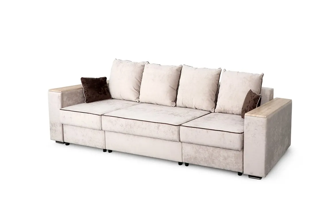 С одной стороны расположена боковина с нишей, с другой – ящики. Надежные петли с доводчиками добавляют комфортности использования мебели. Диван-трансформер может быть прямым, угловым и П-образным. Малые декоративные подушки входят в комплект дивана.