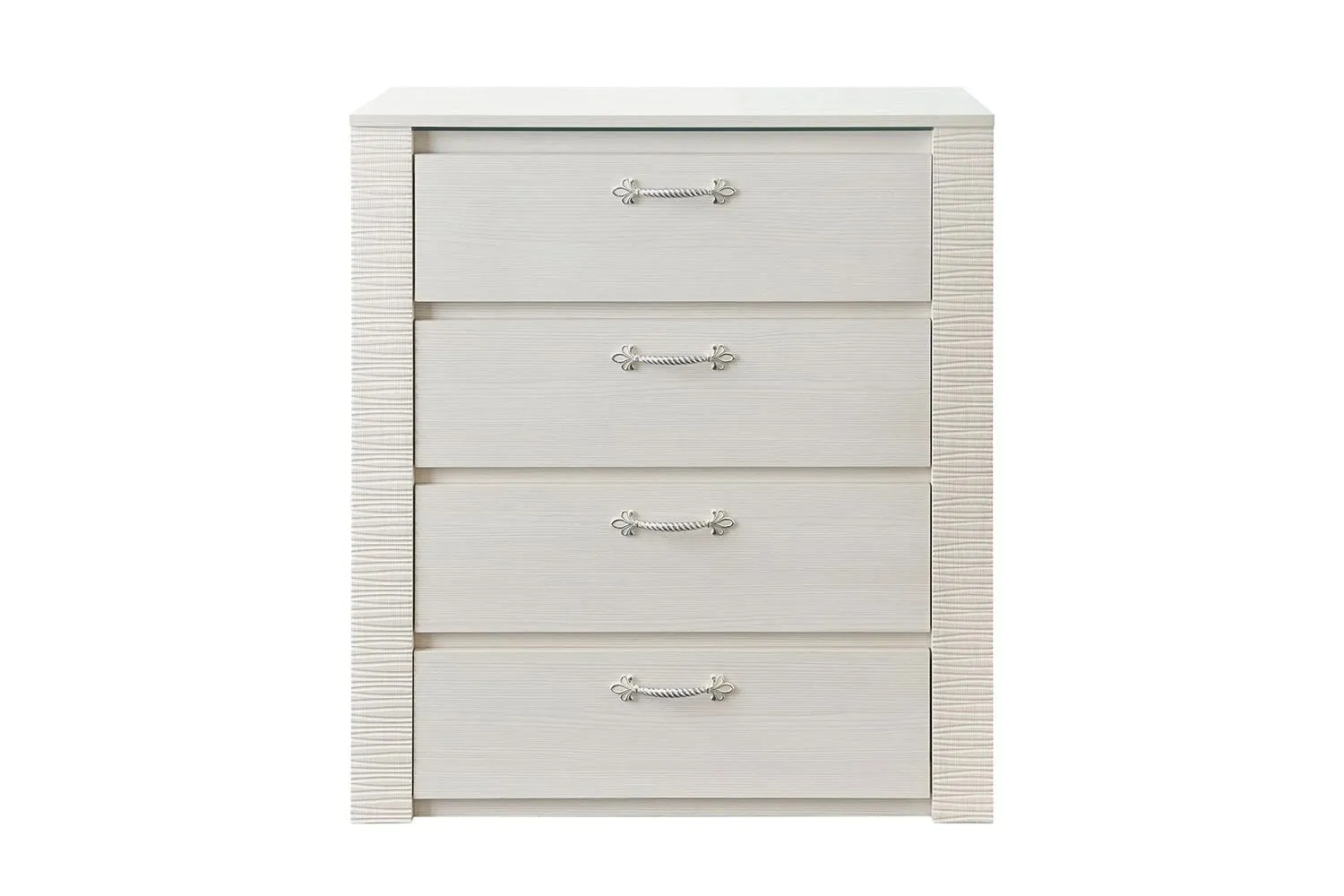 Комод оснащен четырьмя выдвижными ящиками на роликовых направляющих. Под столешницей имеется стеклянная панель (5 мм), предназначенная для установки светильника. Комплект подсветки (светильник и блок питания) приобретается отдельно. Блок питания рассчитан на подключение шести светильников.