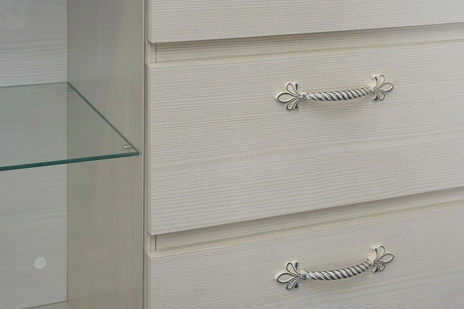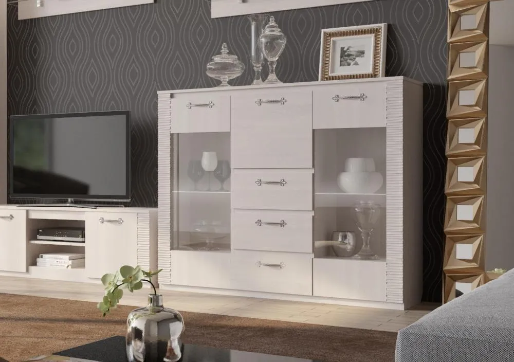 По центру комода располагаются три ящика на роликовых направляющих, над которыми имеется отделение бара закрытое глухой дверцей. Боковые отделения закрыты распашными дверцами со стеклом. Каждое из отделений оснащено двумя стационарными полками и съёмной стеклянной полкой, на которую можно установить светильник.