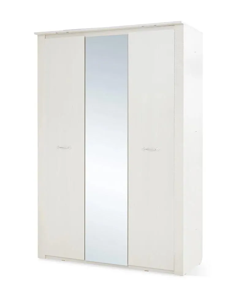 Трехдверный шкаф с зеркалом "Элана" оснащен двумя отделениями: для белья с четырьмя съёмными и центральной жёсткой полкой; платяное с жесткой полкой и продольной стальной штангой. В колпаке шкафа имеются пазы для двух светильников, входящих в комплект. Блок питания приобретается отдельно, и рассчитан на подключение шести светильников.