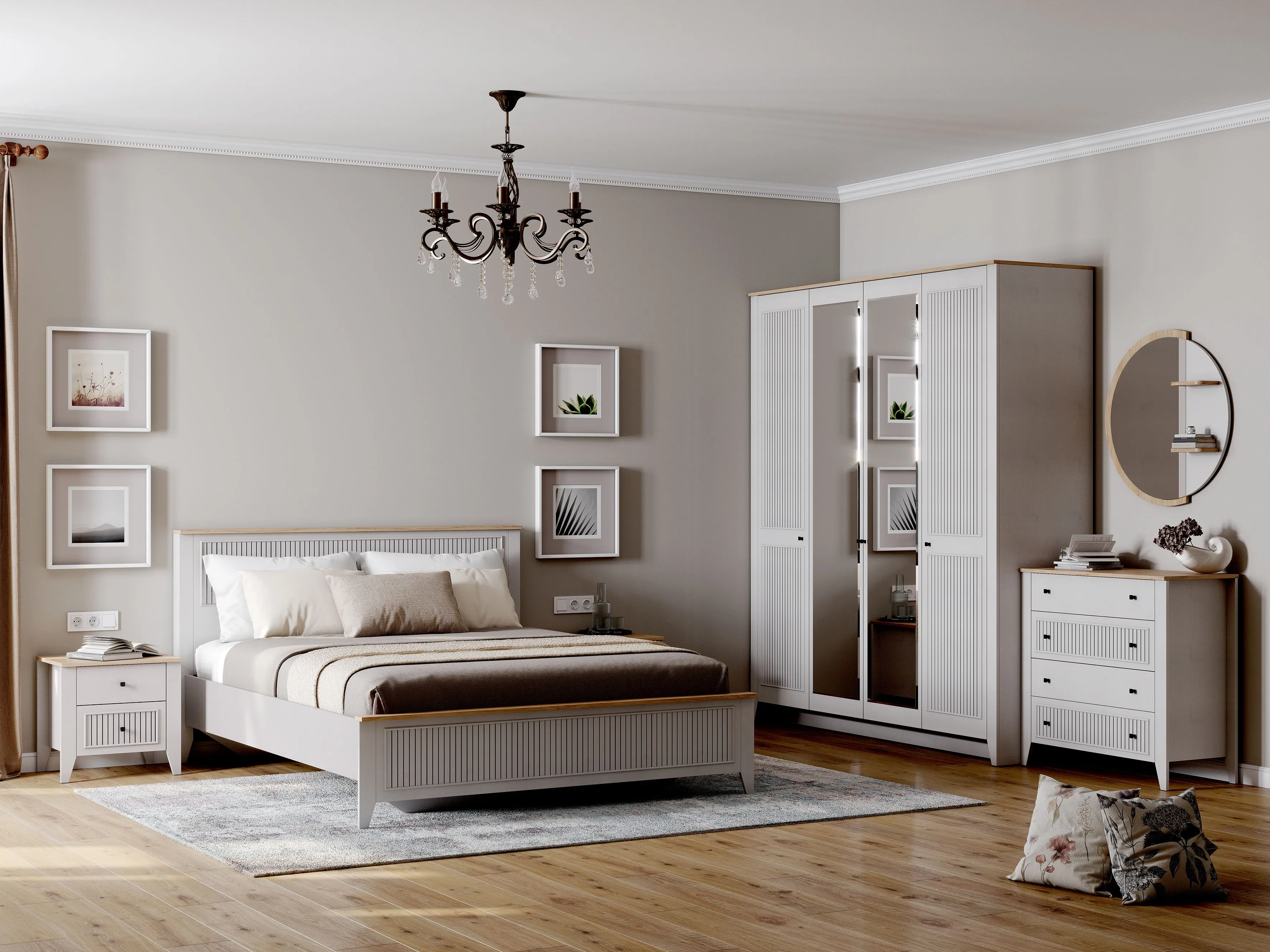 Спальня в цветовом решении "Персидский жемчуг/ Дуб натуральный светлый" придаст интерьеру воздушность, ощущение нежности и легкости, наполнив спальную комнату светом.