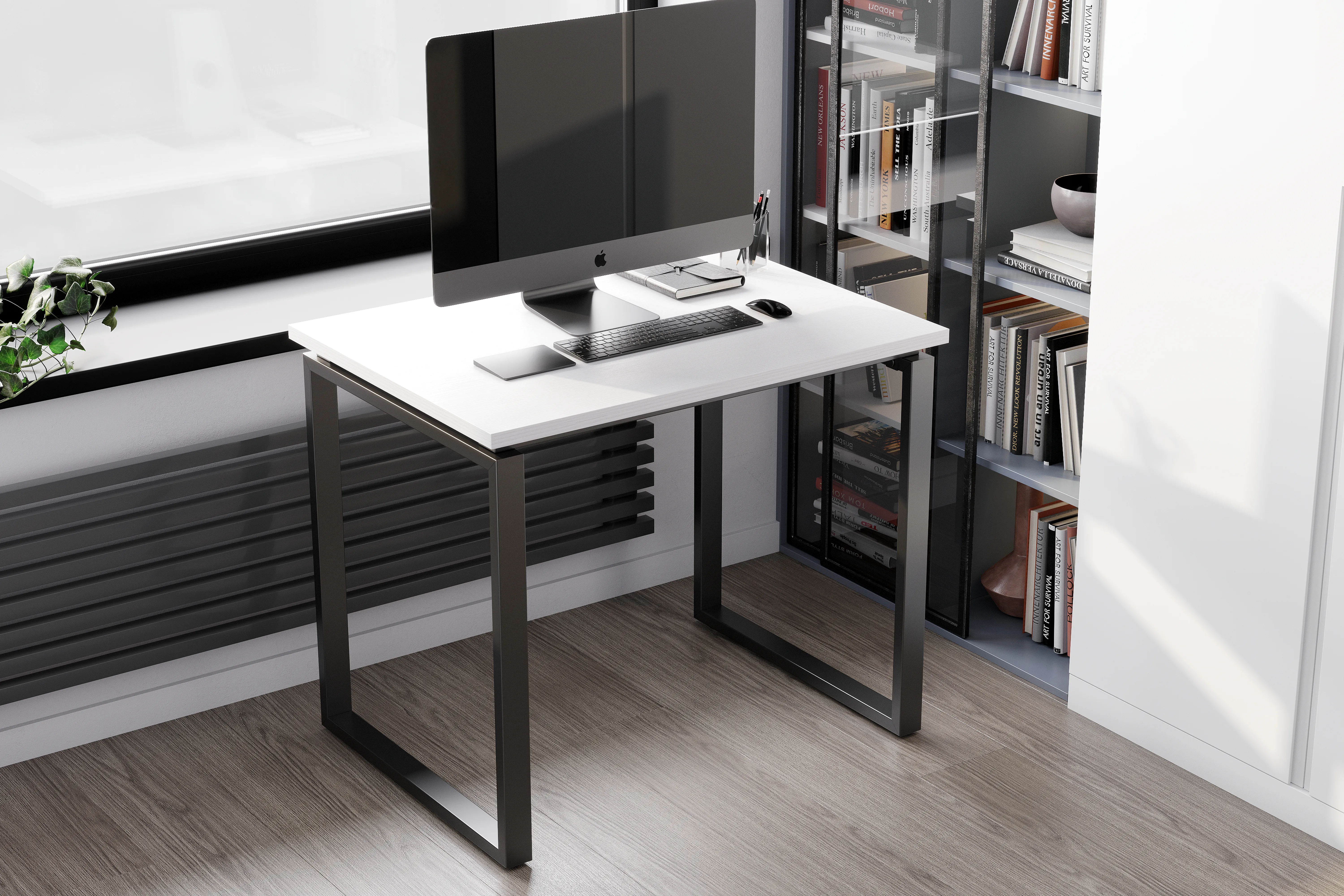 Металлический каркас для стола из прямоугольных замкнутых опор с парящей столешницей. Cкрытые под столешницей связи не позволяют столу шататься как на отдельных ножках