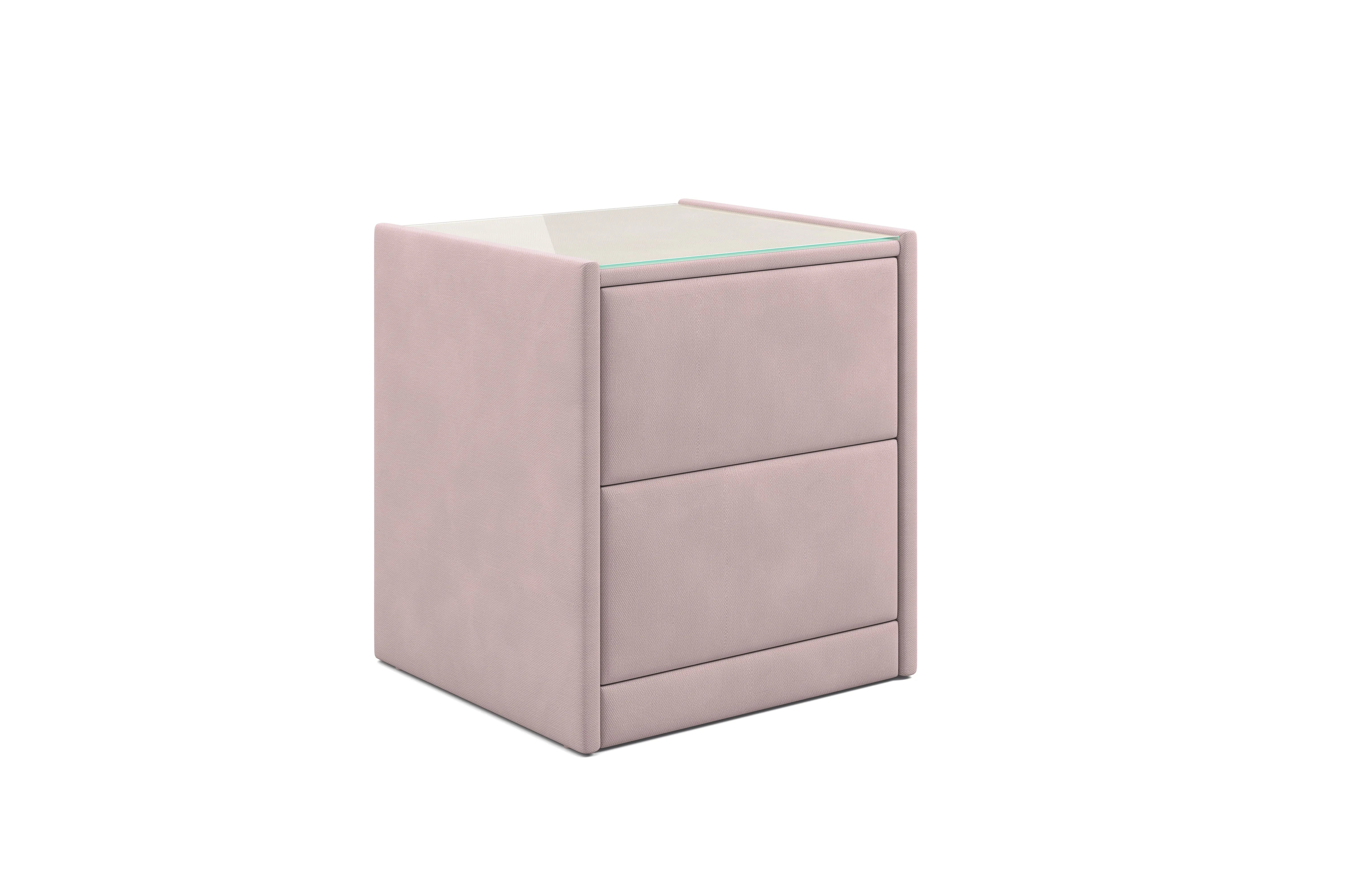 Тумба обтянута высококачественным велюром, что придает ей особый уют и комфорт. Имеет стеклянную столешницу и два вместительных выдвижных ящика с механизмом Push to open. Скругленные торцы модели, минимизируют риск удариться в темноте.