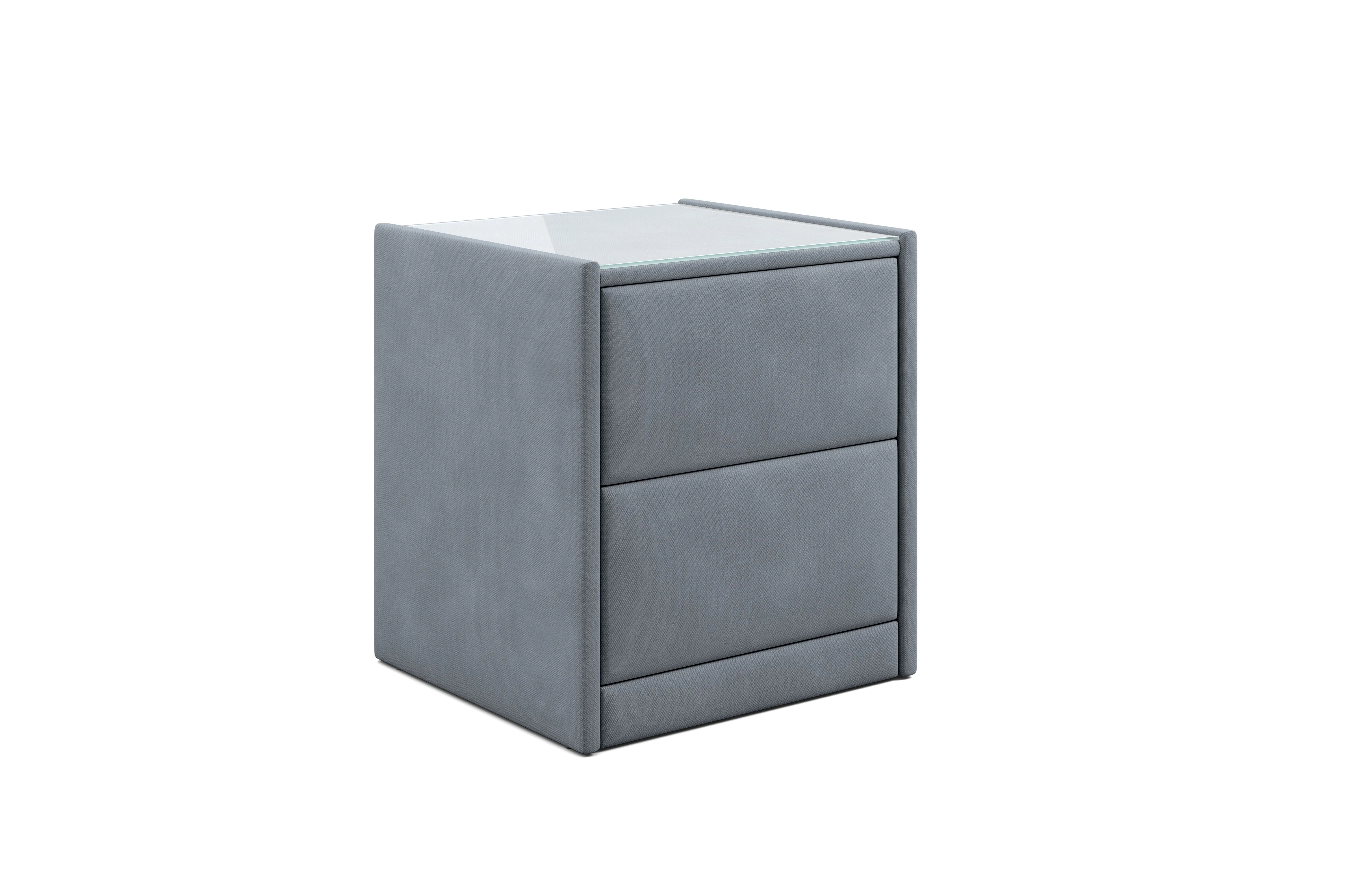 Тумба обтянута высококачественным велюром, что придает ей особый уют и комфорт. Имеет стеклянную столешницу и два вместительных выдвижных ящика с механизмом Push to open. Скругленные торцы модели, минимизируют риск удариться в темноте.