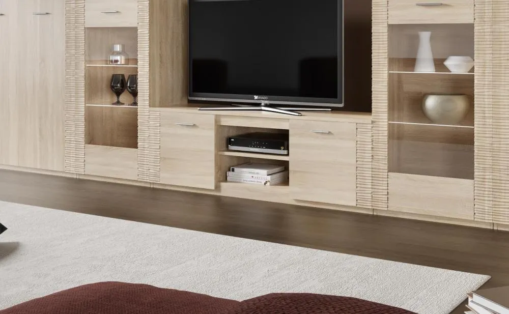 Тумба по ТВ имеет две ниши, закрытые дверцами и центральная открытая с одной съёмной полкой. Под крышкой установлена стеклянная панель для крепления светильников "HLT Prismatic FT".