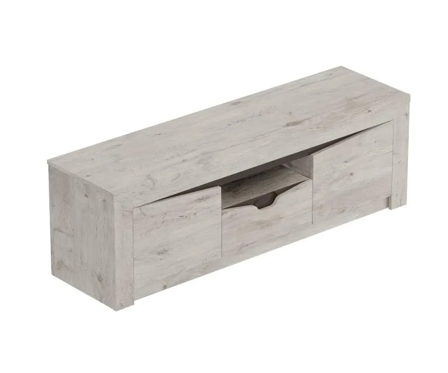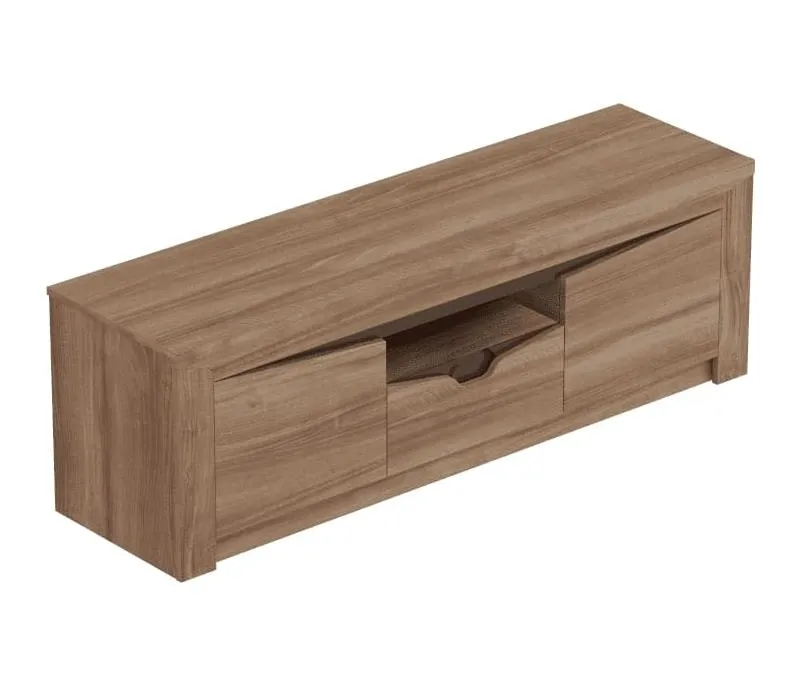 Тумба под ТВ изготовлена из качественных, безопасных материалов, что гарантирует надежность и долговечность изделия. Имеет вместительный выдвижной ящик по центру и два отделения с дверями по бокам.